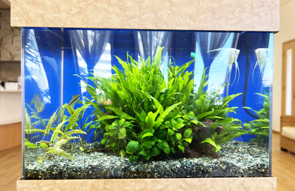 こちらの水槽は、ろ過フィルターの吐出口を水中に入れることで、水が落ちる音を抑えるよう調整しています。