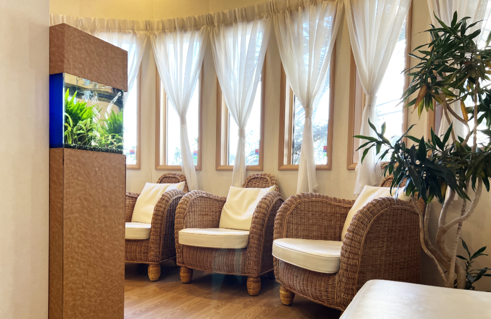 南国風の家具や観葉植物などの院内のインテリアにもよく馴染み、明るく開放感のある空間をより魅力的に演出しています。