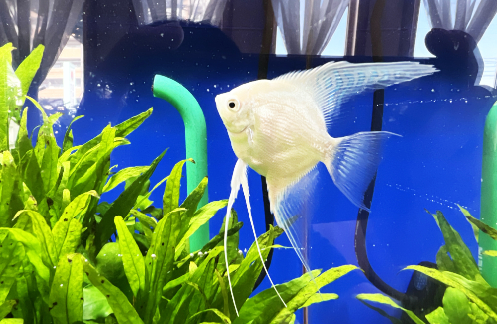 緑豊かな水草に、光沢感のあるエンゼルフィッシュの白い体色が映え、熱帯魚の美しさをしっかり堪能できます。