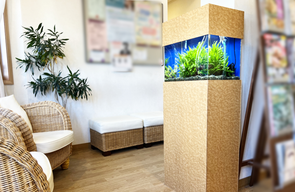 座ったままでも無理なく水槽を眺めることができるため、診察前のひとときをリラックスして過ごせる空間づくりにつながっています。